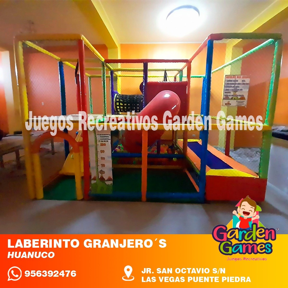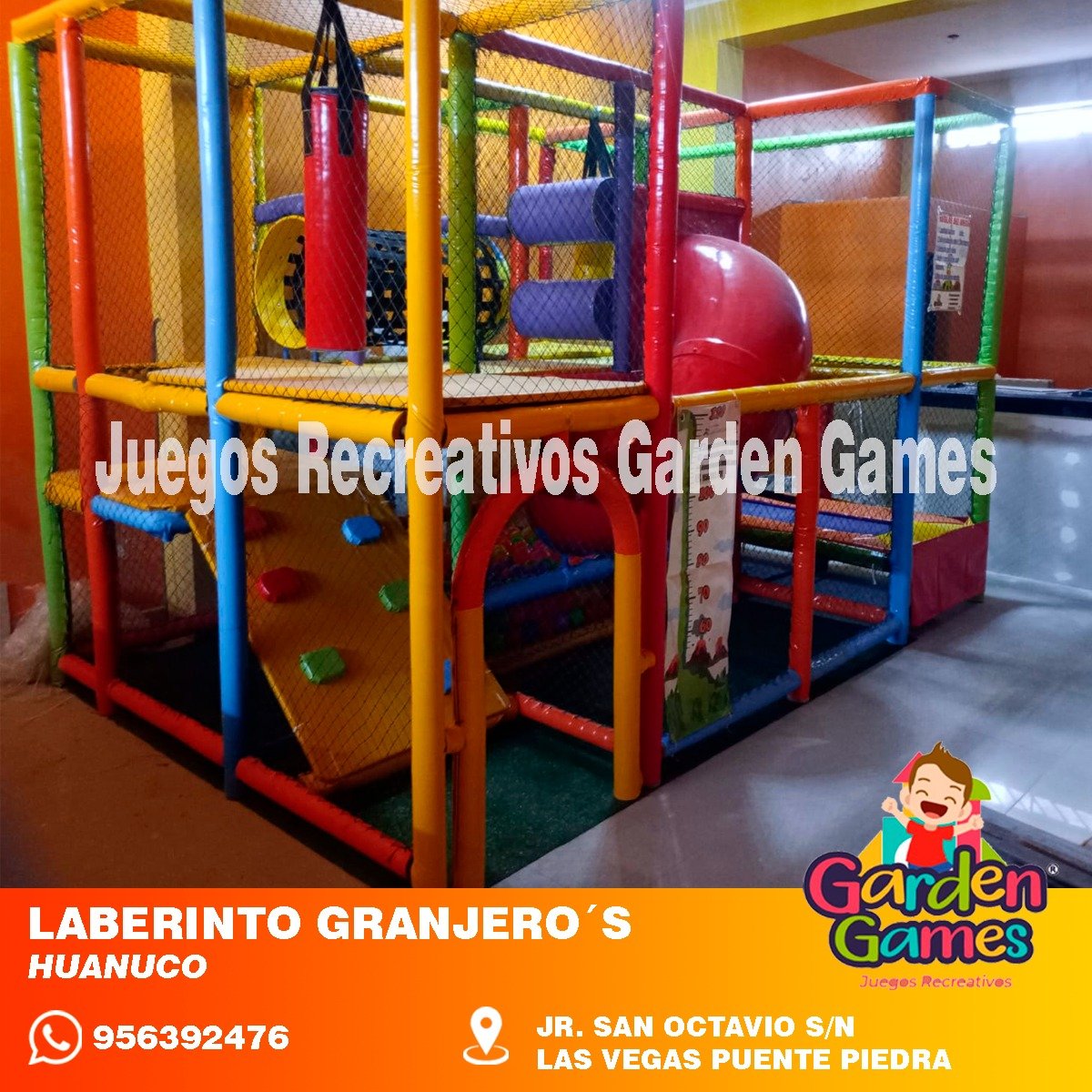 Elaborado en tubo GALVANIZADO LAF redondo de 1 1/4”, 1″, 3/4” y 1/2″ . Totalmente acolchado con Espuma Zebra de 1″ color lila – celeste y Lila de alta densidad y forrado en lona Concord con protección UV de colores para niños, malla nylon de 3″ N36 y fibra de vidrio para toboganes. Pisos de madera forrados con microporoso de 6mm de espesor y tapizando con lino pesado antideslizante para darle mayor duración.